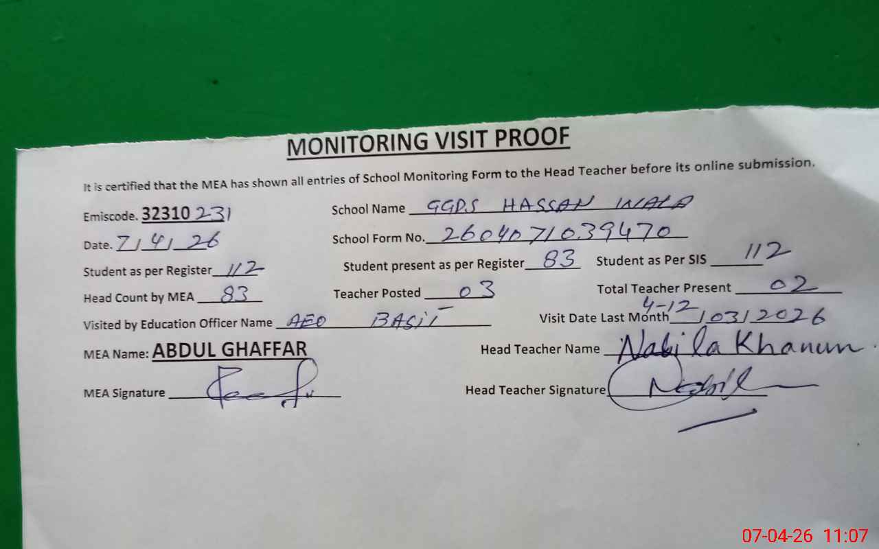| EMIS Code: 32310231 | Name of School: GGPS HASSAN WALA | |||