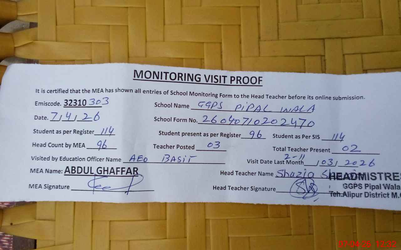 | EMIS Code: 32310303 | Name of School: GGPS PIPAL WALA | |||