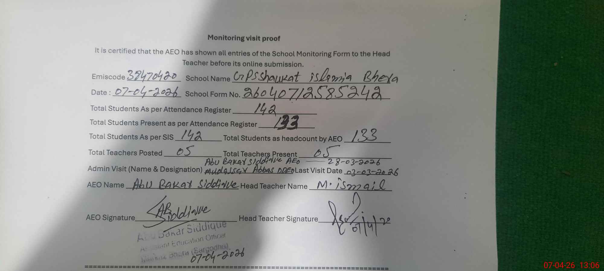 | EMIS Code: 38470420 | Name of School: GPS SHAUKAT ISLAMIA BHERA | |||