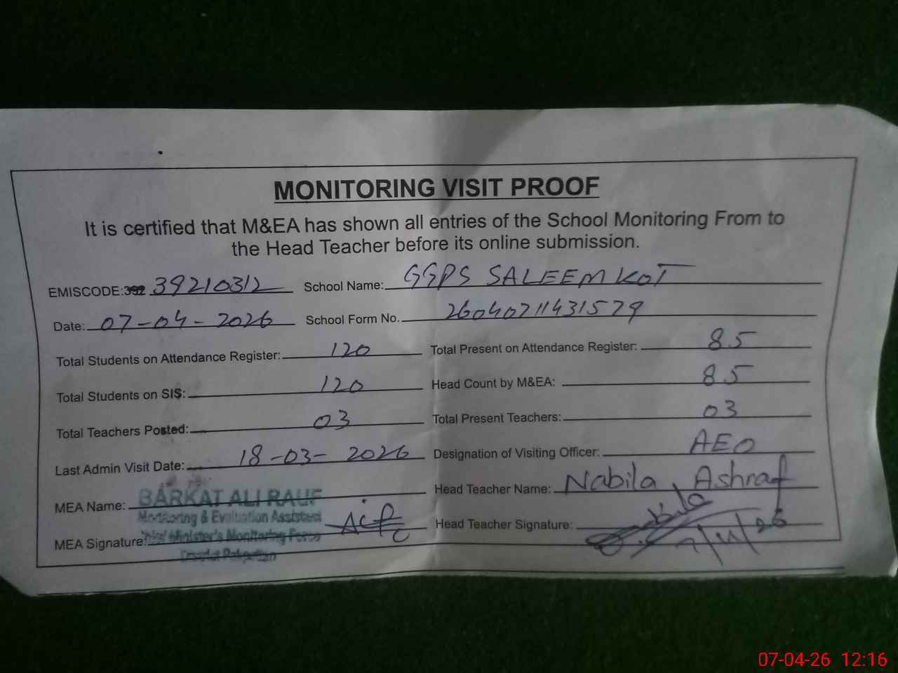| Attendance Register | Head Teacher | MEA with School | Visit Proof |