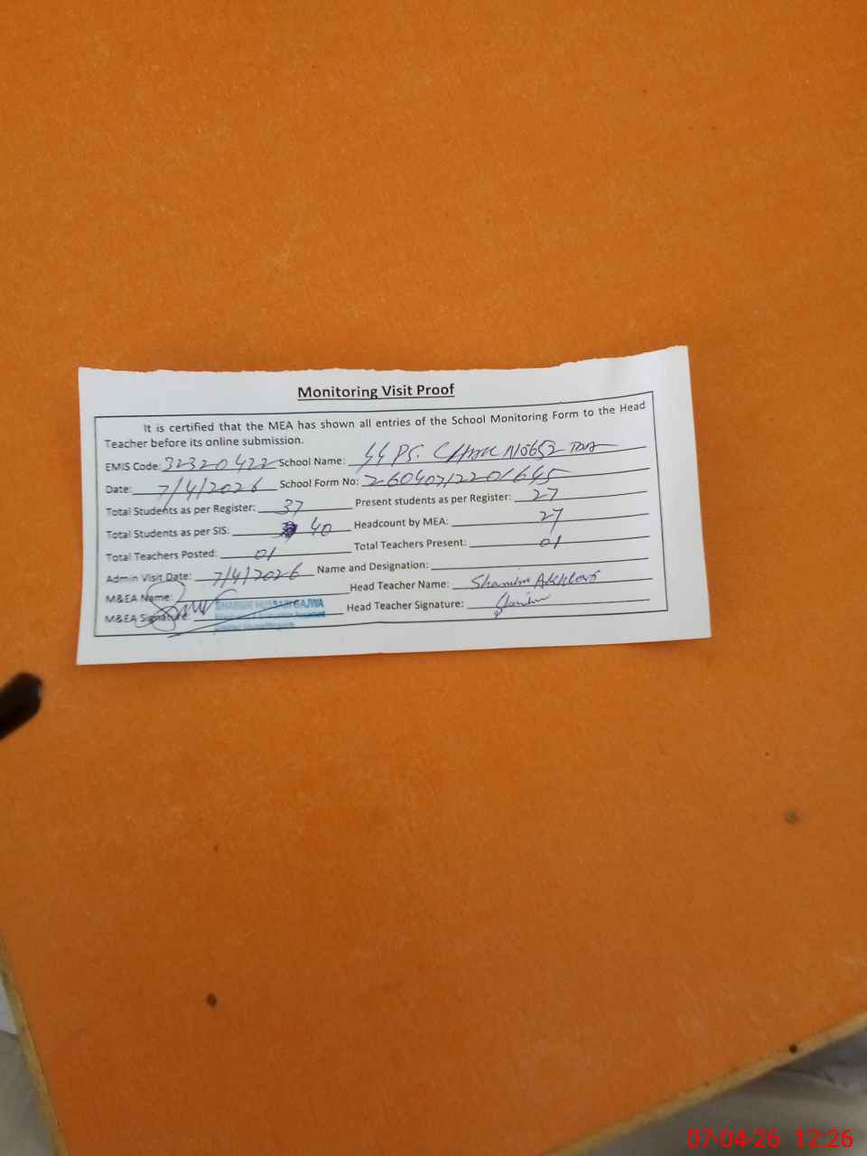 | Attendance Register | Head Teacher | MEA with School | Visit Proof |