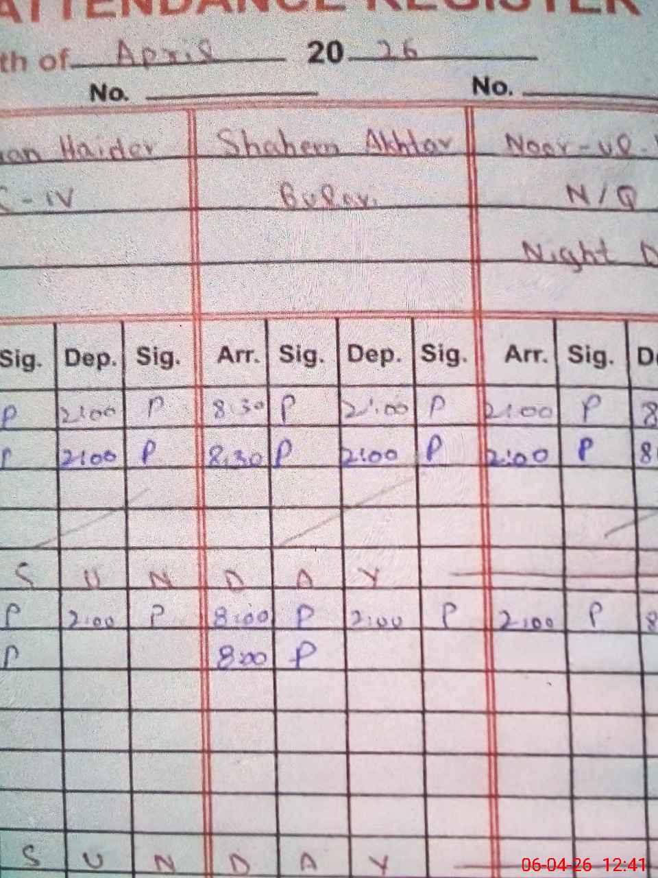 | CNIC | Full Name | Designation | R/C | Absence During Last Calender Month |