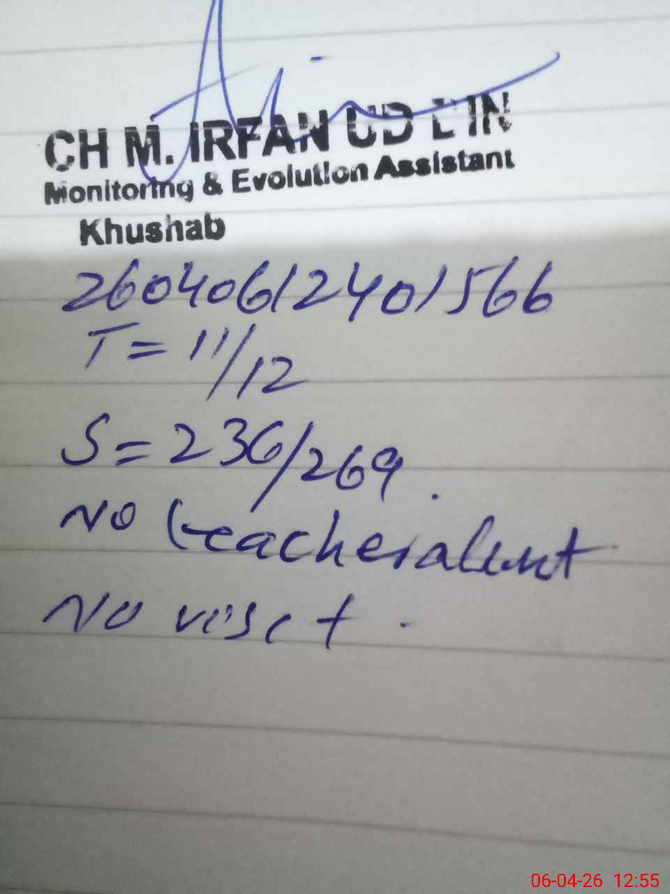 | Remarks (Use Separate Page if Required): gghs jaba student on sis 293 student on register 269 head count 236 no teacher absent last visit no visit 2 class rooms are dangerous need repair security guard required 10 th class is in exam | |||||
