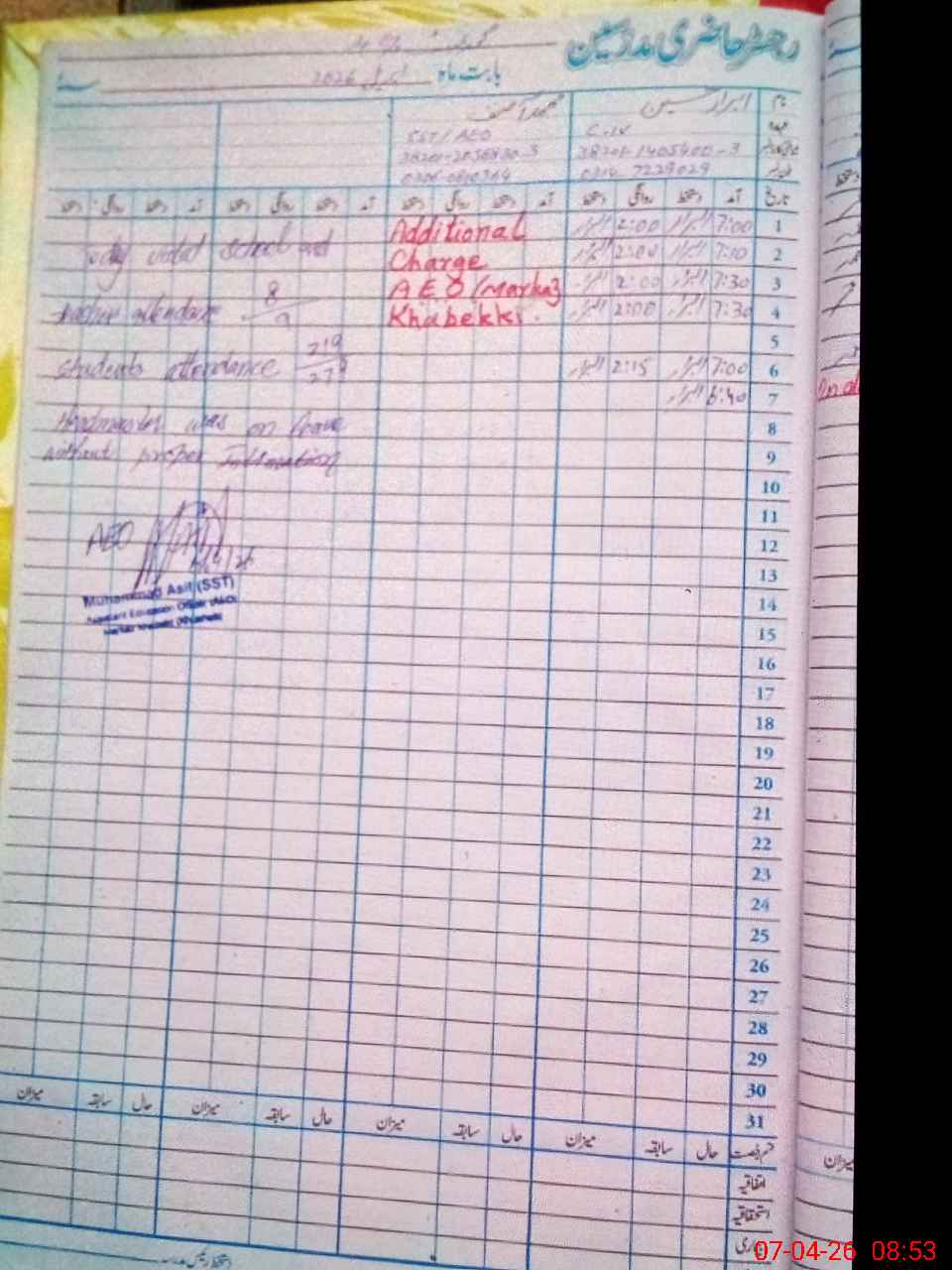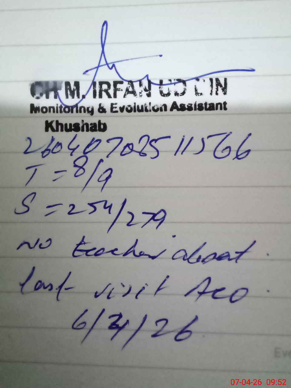 | Remarks (Use Separate Page if Required): GES jaba student on sis 280 student on register 279 head count 254 no teacher absent one on aeo duty last visit aeo 6/4/26 boundary wall need teaching staff required class room required | |||||