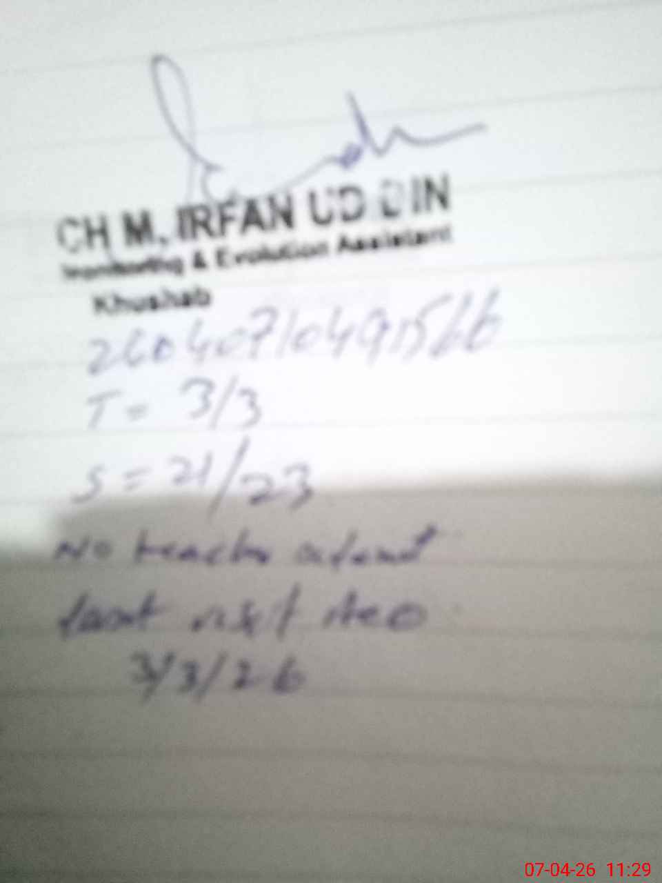 | Remarks (Use Separate Page if Required): gmps dhok khabuki St dent on sis 30 student on register 23 head count 21 no teacher absent last visit aeo 3/3/26 | |||||