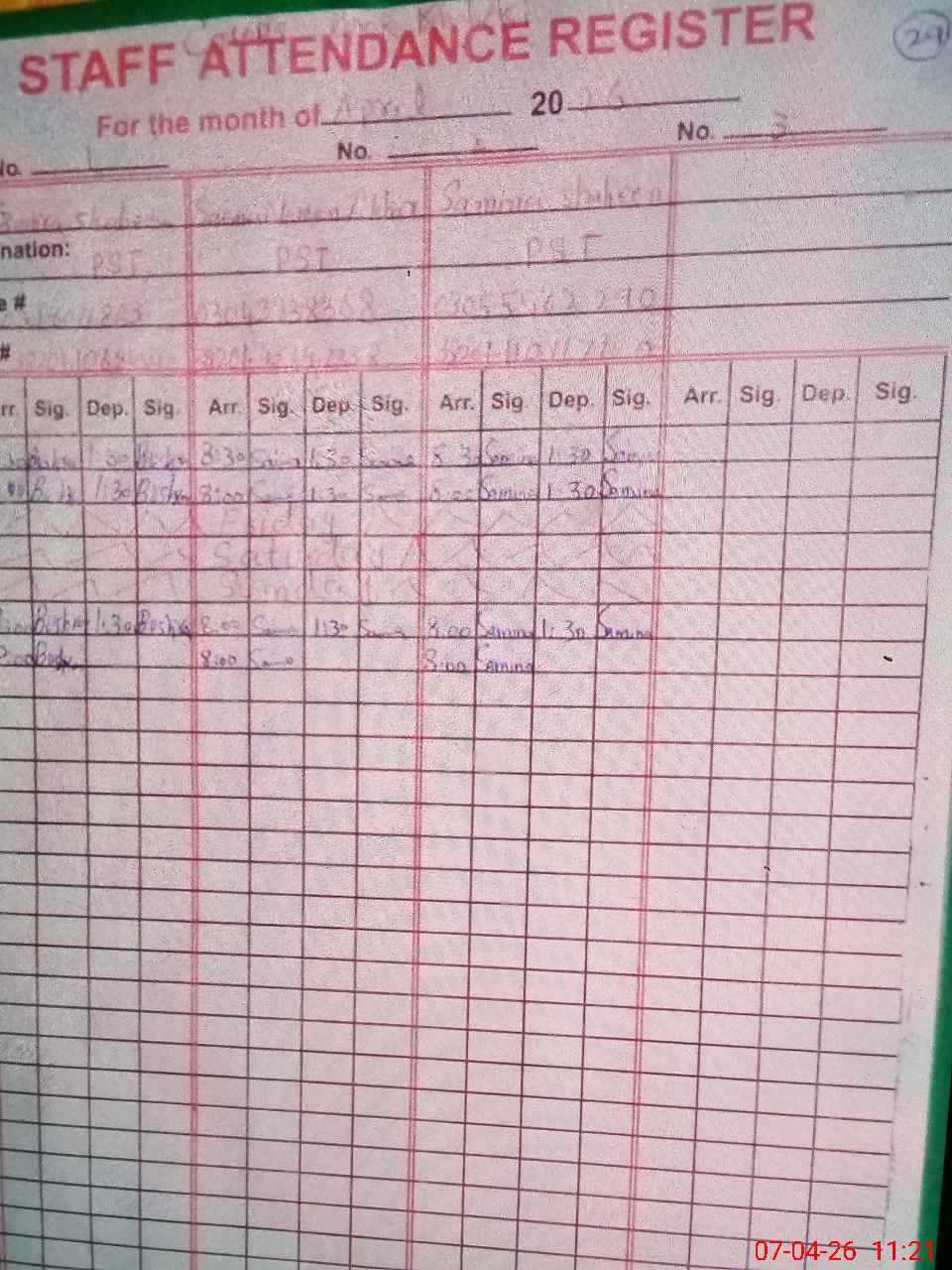 | CNIC | Full Name | Designation | R/C | Absence During Last Calender Month |
