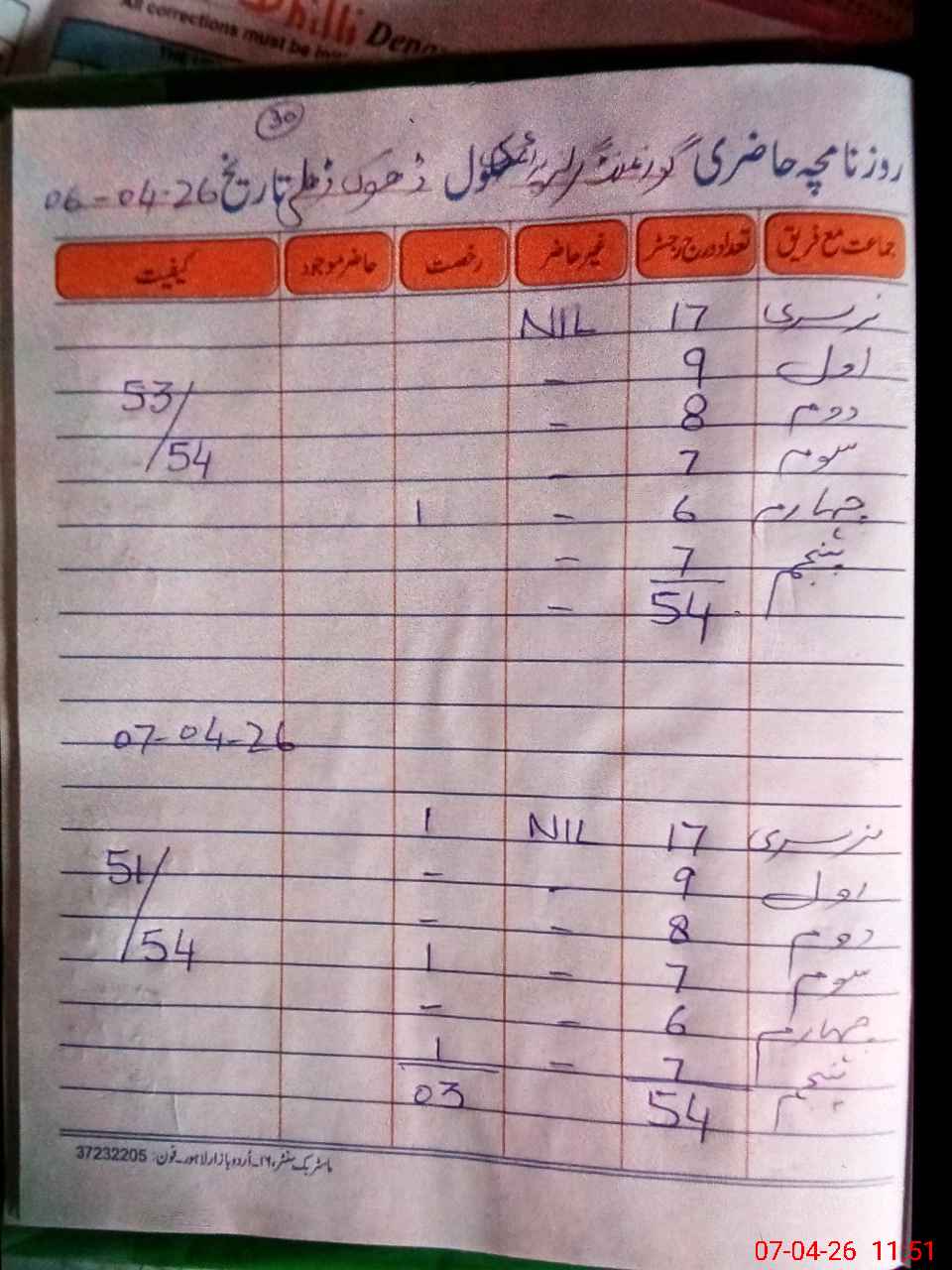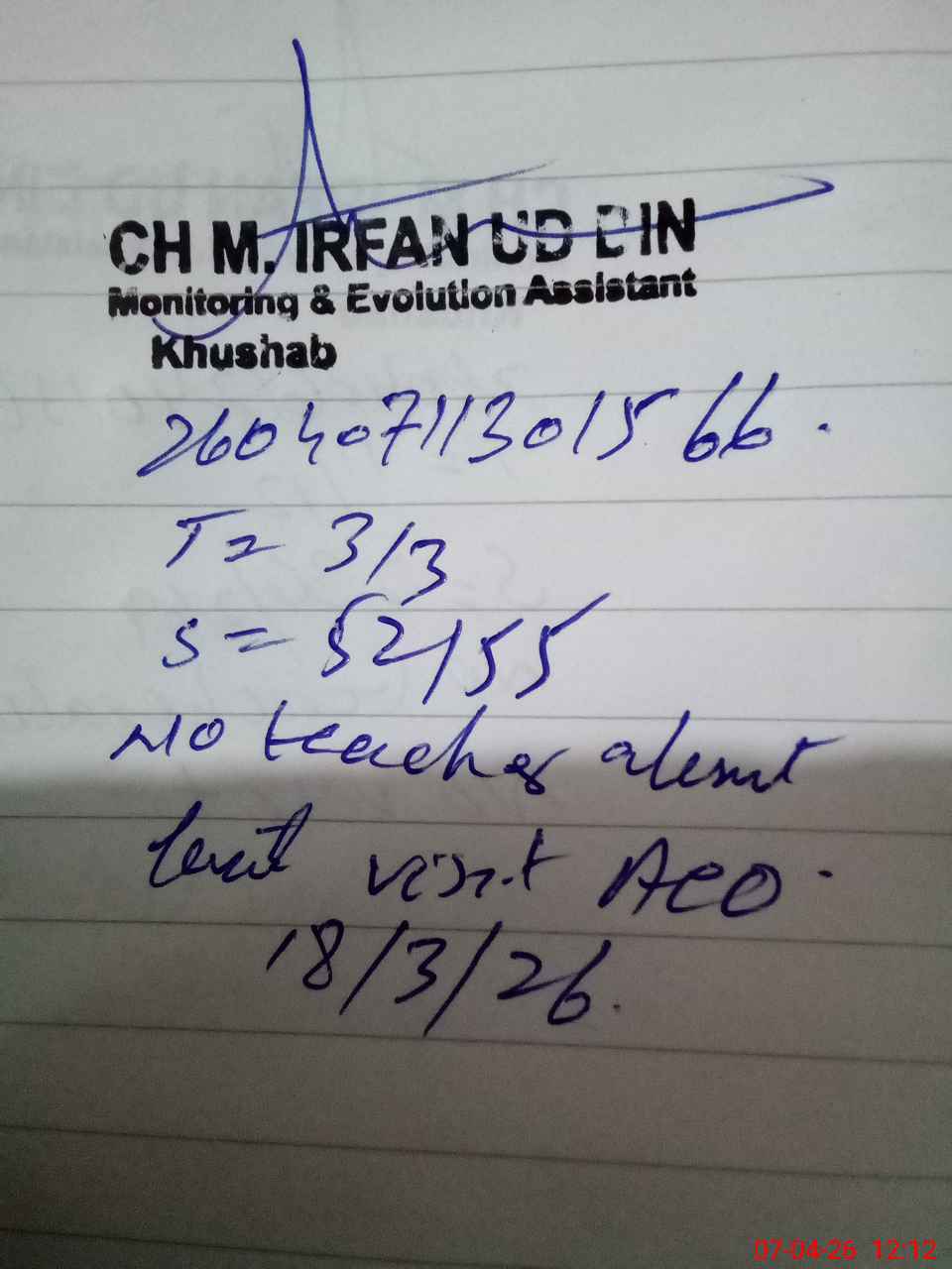 | Remarks (Use Separate Page if Required): ggps dhok dhili student on sis 53 student on register 55 head count 52 no teacher absent last visit aeo 18/3/26 water source required nsb grant is low | |||||