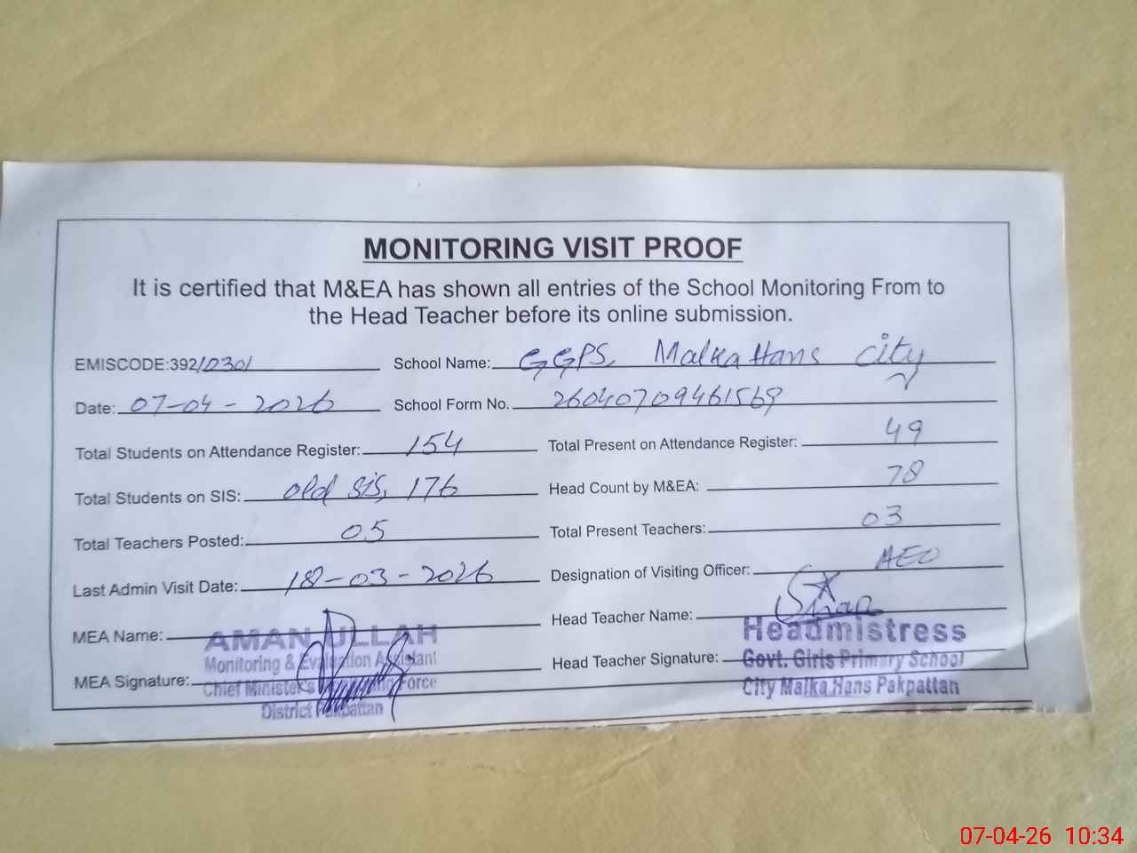 | Attendance Register | Head Teacher | MEA with School | Visit Proof |