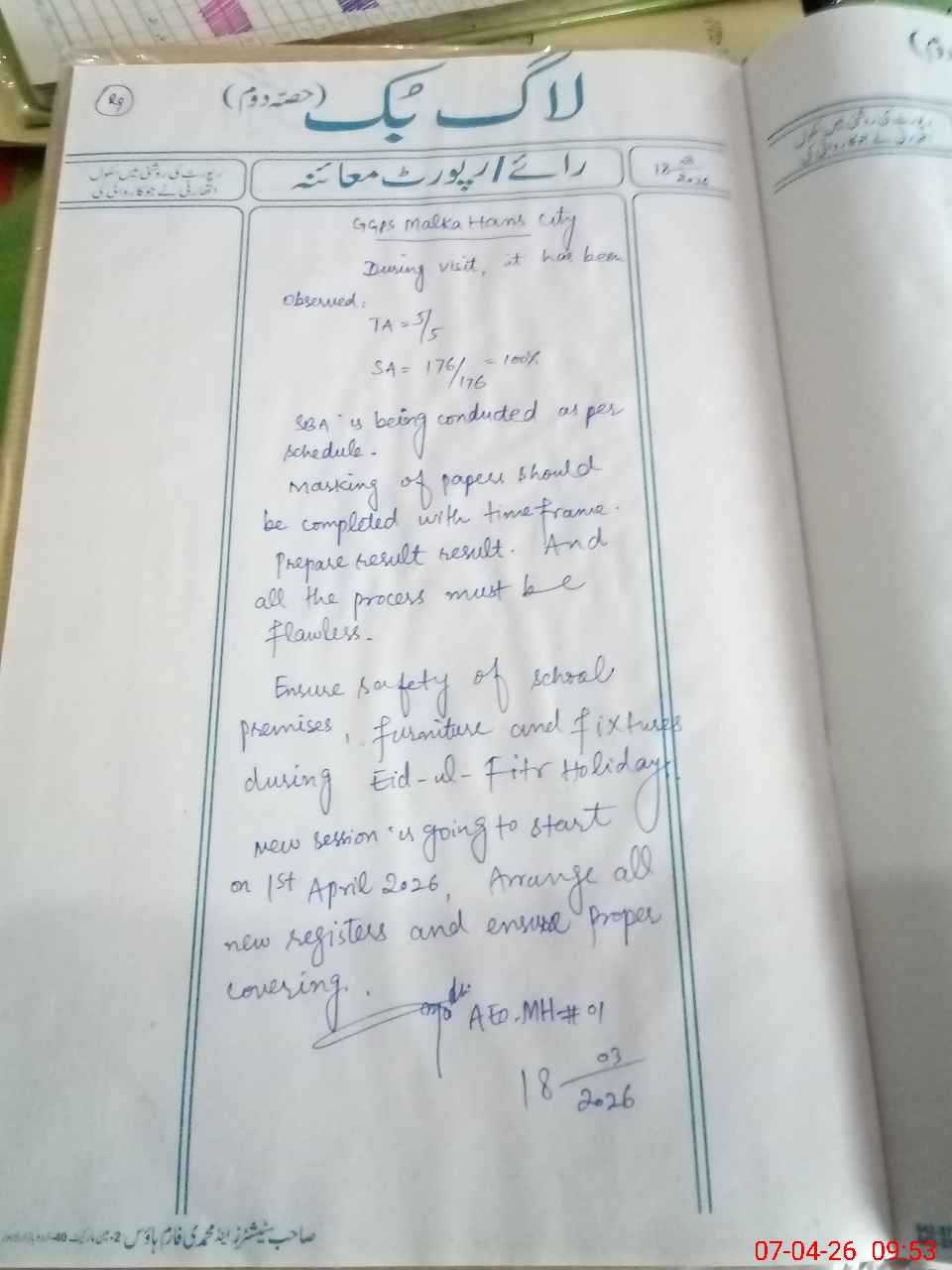 | Certified that this School was Inspected by the Undersigned MEA/DMO Today and the Information Stated Above is as Per Record. | |||||