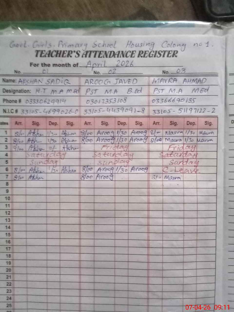 | CNIC | Full Name | Designation | R/C | Absence During Last Calender Month |