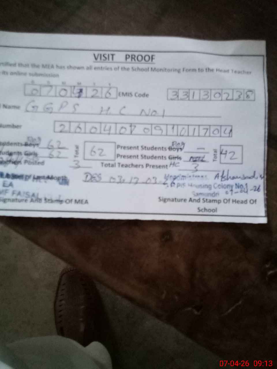 | Attendance Register | Head Teacher | MEA with School | Visit Proof |