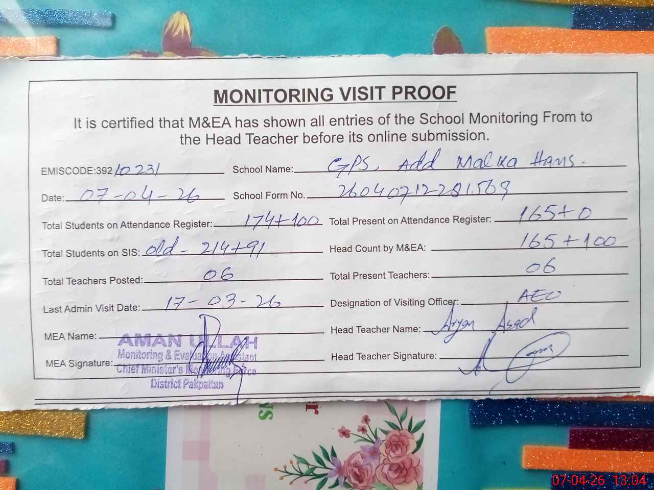 | Attendance Register | Head Teacher | MEA with School | Visit Proof |