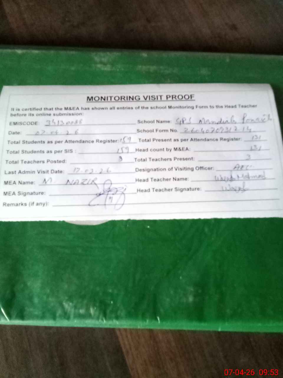 | Attendance Register | Head Teacher | MEA with School | Visit Proof |