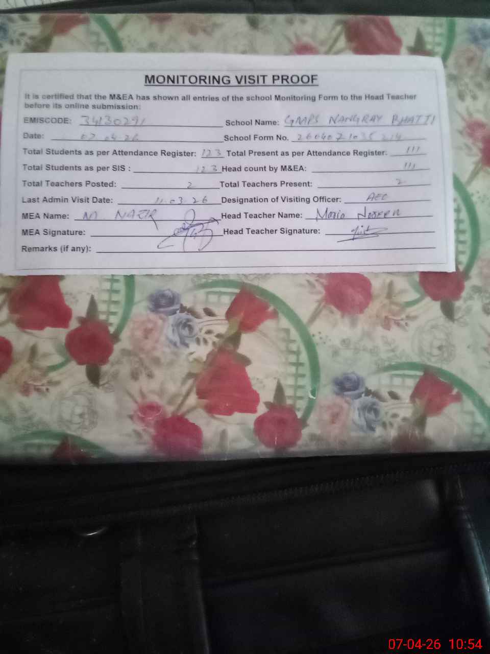 | Attendance Register | Head Teacher | MEA with School | Visit Proof |