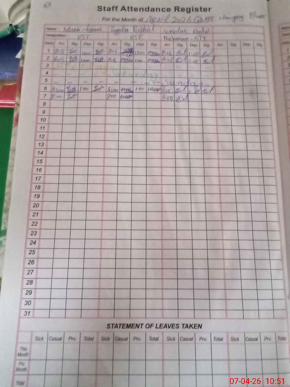 | Leave | Duty | Absent | Maternity | Medical | Ex- Pak |