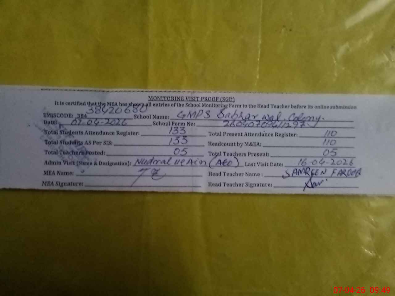 | Attendance Register | Head Teacher | MEA with School | Visit Proof |