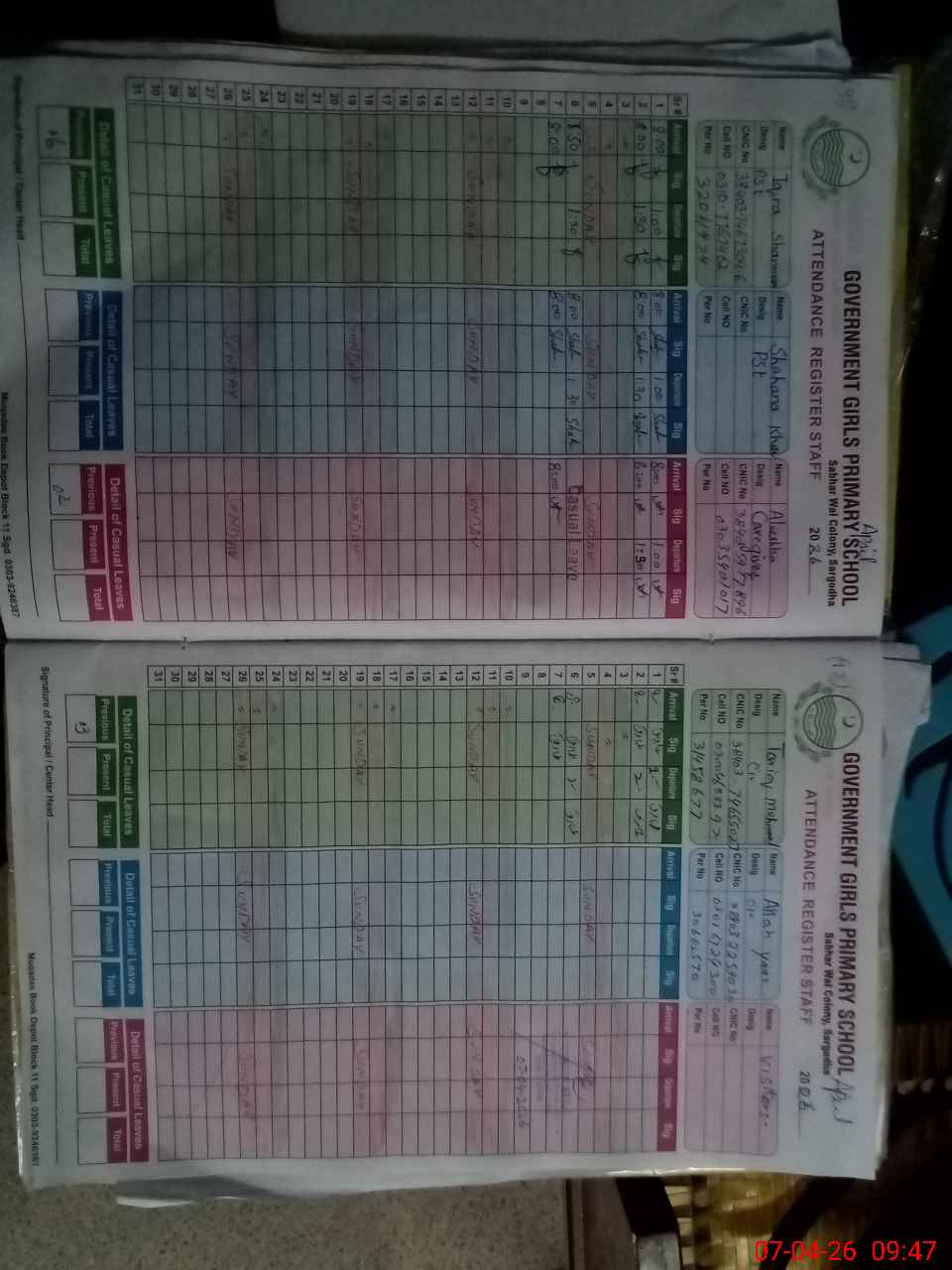 | CNIC | Full Name | Designation | R/C | Absence During Last Calender Month |