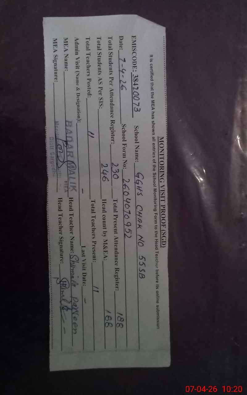 | EMIS Code: 38420073 | Name of School: GGHS CHAK NO.55 SB | |||