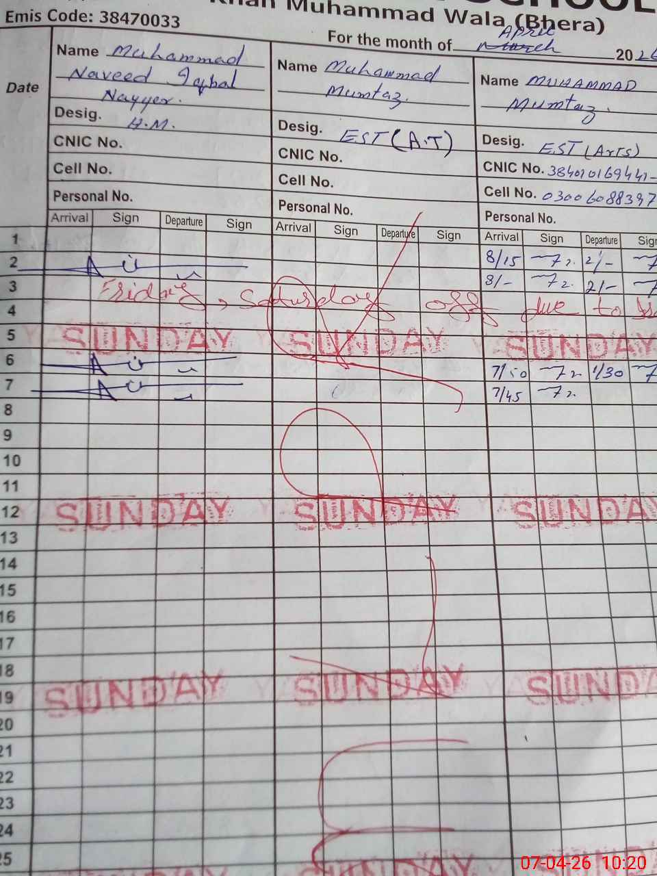 | CNIC | Full Name | Designation | R/C | Absence During Last Calender Month |
