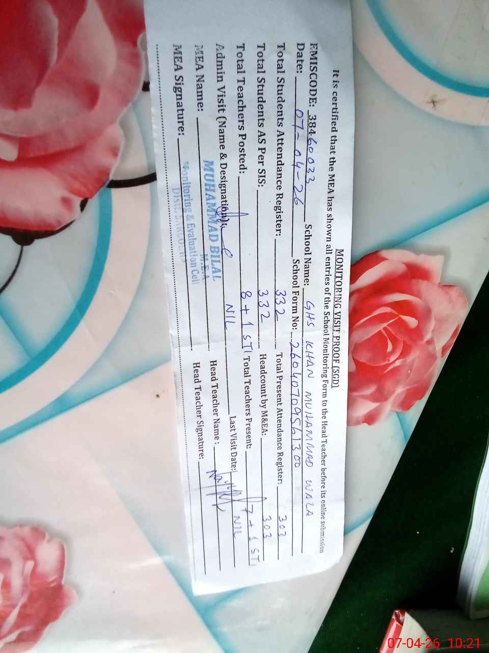 | Certified that this School was Inspected by the Undersigned MEA/DMO Today and the Information Stated Above is as Per Record. | |||||