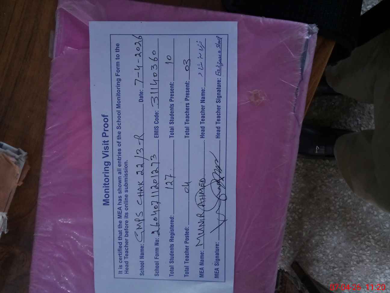 | Attendance Register | Head Teacher | MEA with School | Visit Proof |