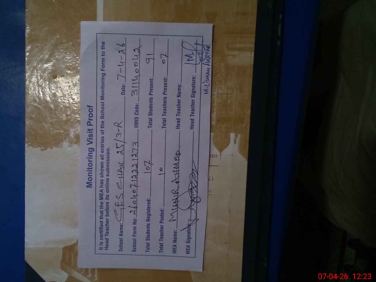 | EMIS Code: 31140042 | Name of School: GES CHAK NO. 25/3-R | |||