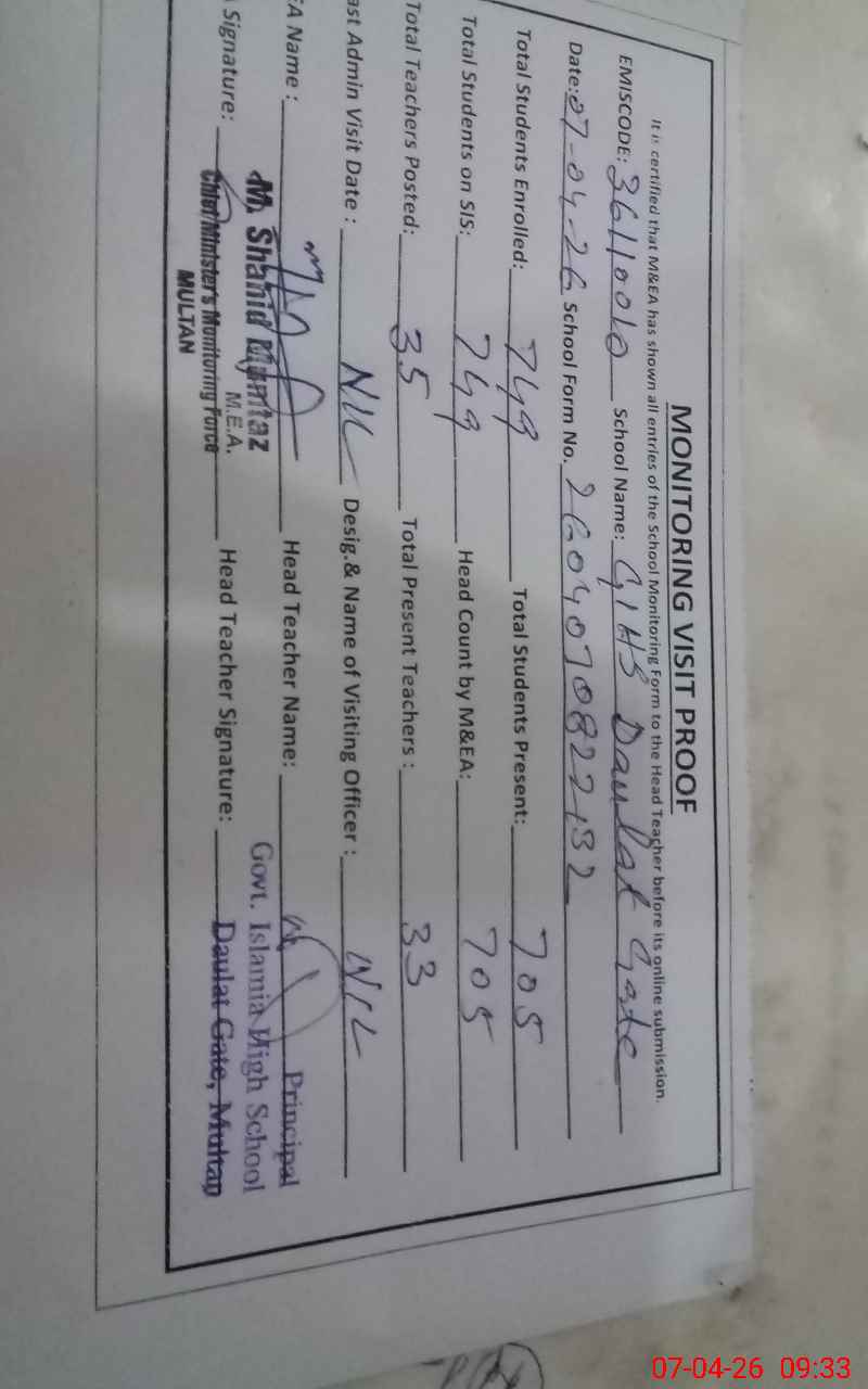 | EMIS Code: 36110010 | Name of School: GHS ISLAMIA DAULAT GATE MULTAN | |||