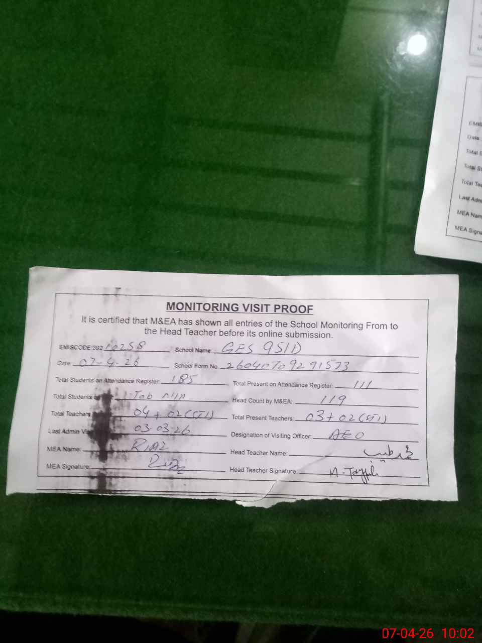 | Attendance Register | Head Teacher | MEA with School | Visit Proof |