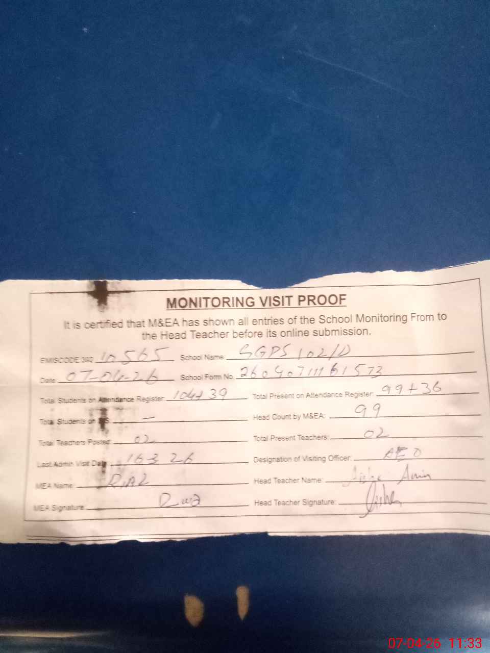 | Attendance Register | Head Teacher | MEA with School | Visit Proof |