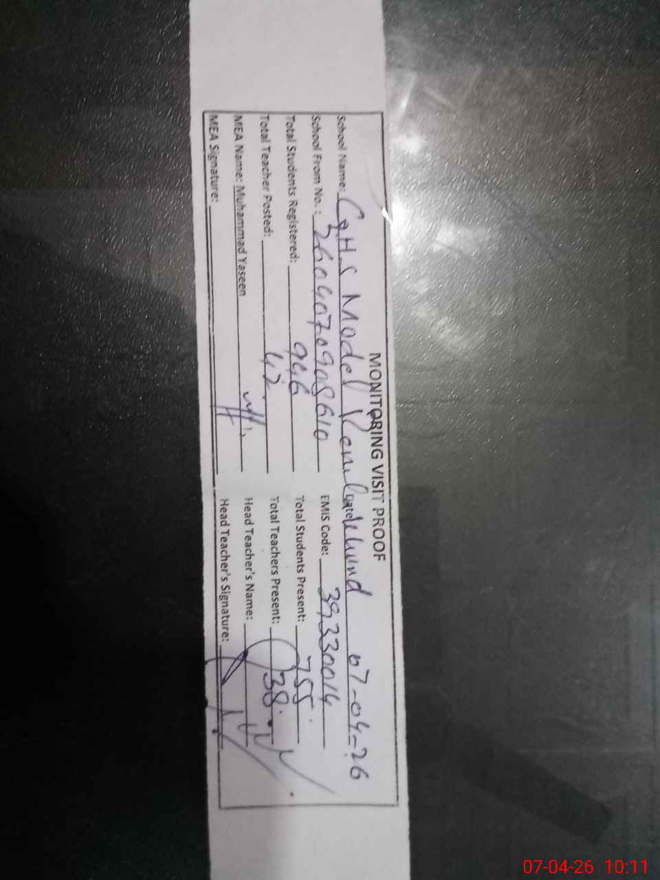 | Attendance Register | Head Teacher | MEA with School | Visit Proof |