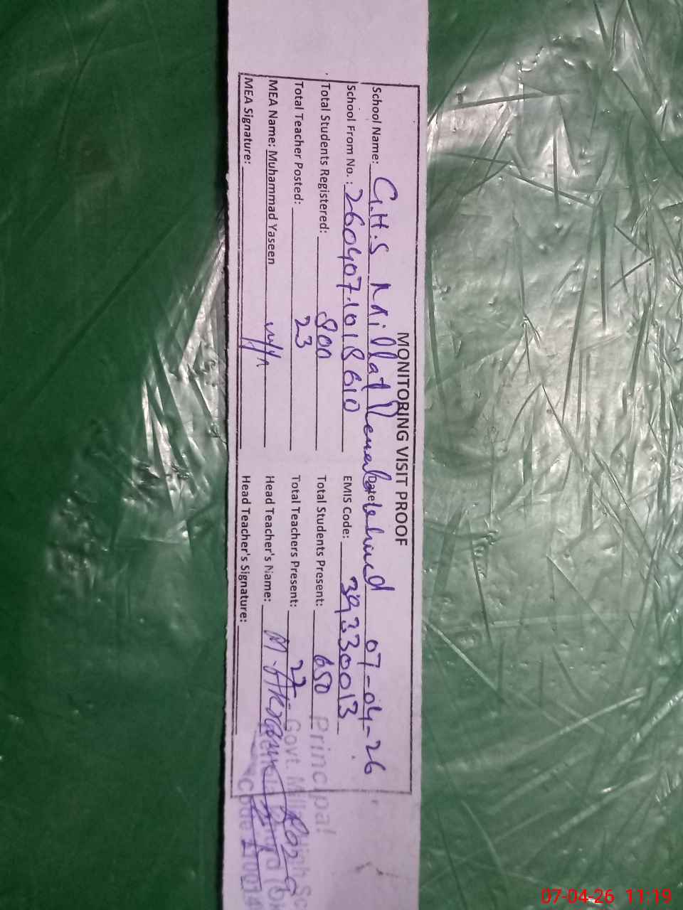 | Attendance Register | Head Teacher | MEA with School | Visit Proof |