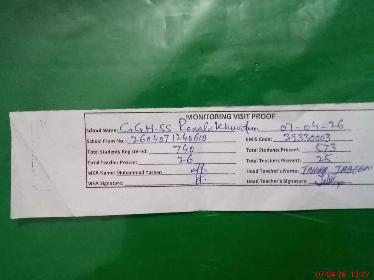 | Attendance Register | Head Teacher | MEA with School | Visit Proof |
