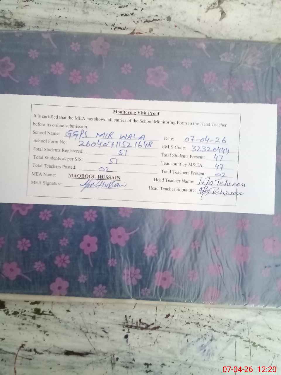 | EMIS Code: 32320444 | Name of School: GGPS MIR WALA | |||