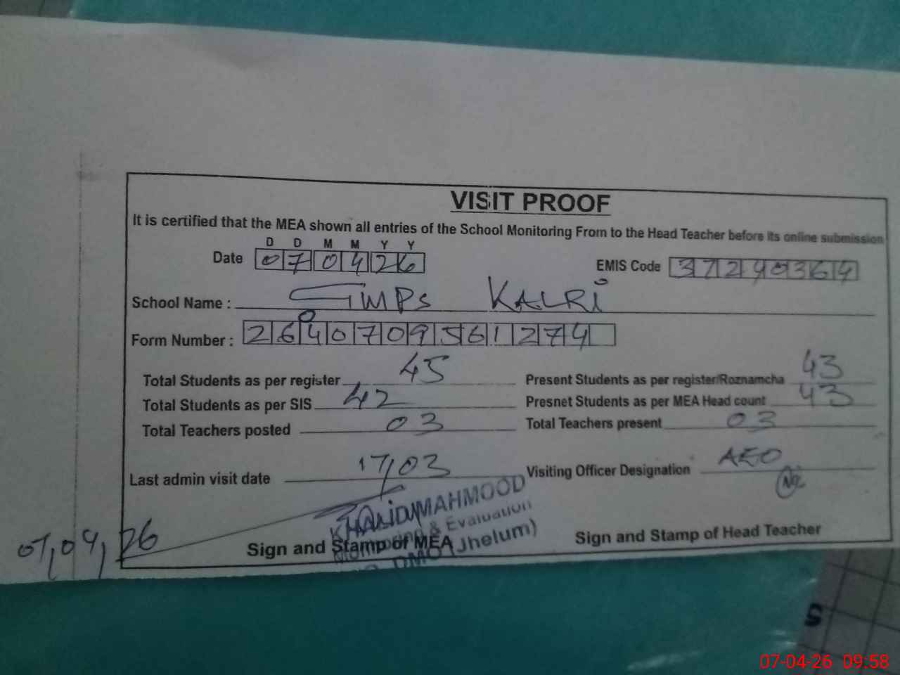 | Attendance Register | Head Teacher | MEA with School | Visit Proof |