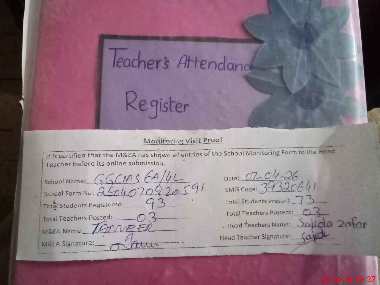 | Attendance Register | Head Teacher | MEA with School | Visit Proof |