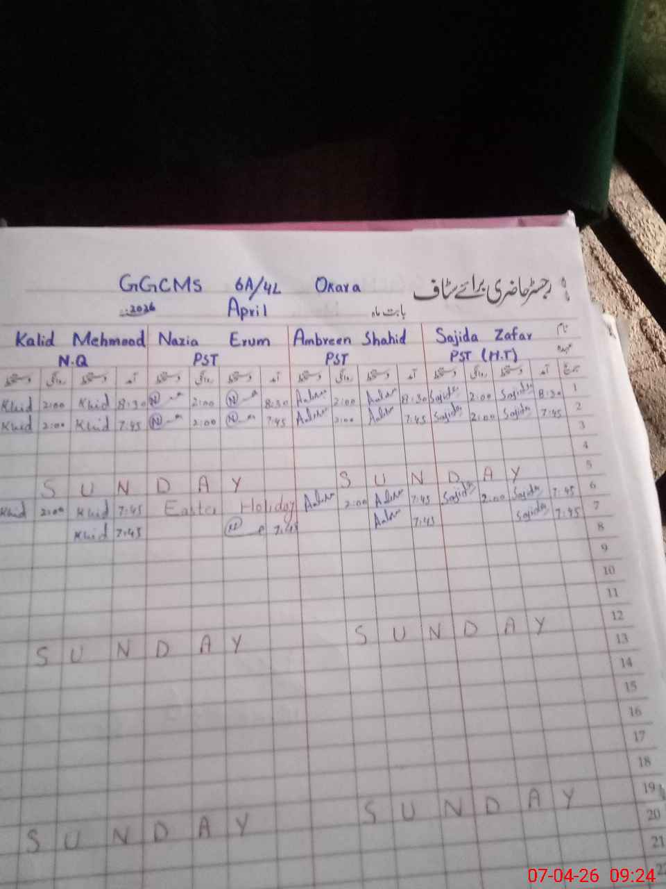| District: OKARA | Tehsil: OKARA | Markaz: 4/4.L-FEMALE | Level: Primary | |