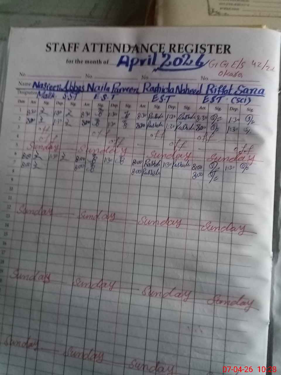 | District: OKARA | Tehsil: OKARA | Markaz: 4/4.L-FEMALE | Level: Middle | |