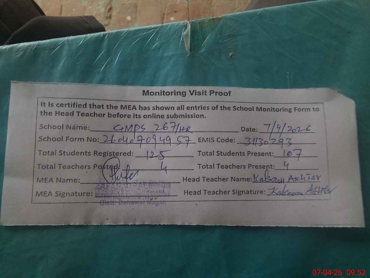 | EMIS Code: 31130293 | Name of School: GMPS CHAK NO 267 HR | |||