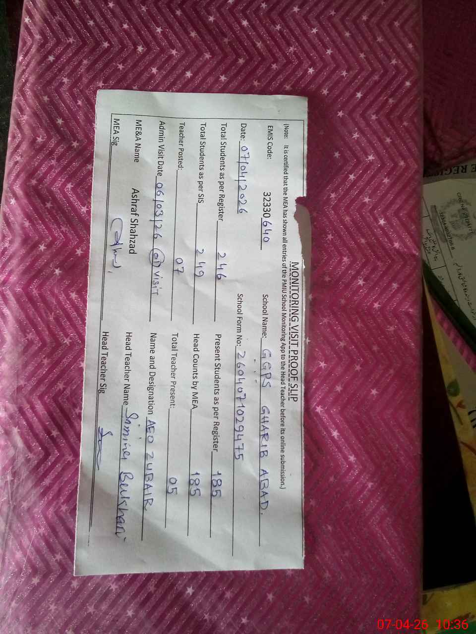 | Monitoring Date: 07-04-2026 | Start Time: 07-04-2026 09:22 AM | End Time: 07-04-2026 10:39 AM | Name of MEA: Mu**** As**** Sh**** | |