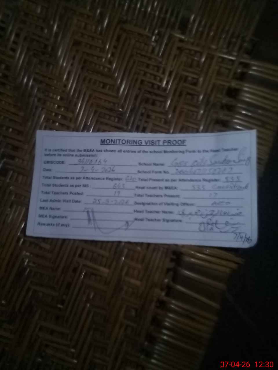 | Attendance Register | Head Teacher | MEA with School | Visit Proof |