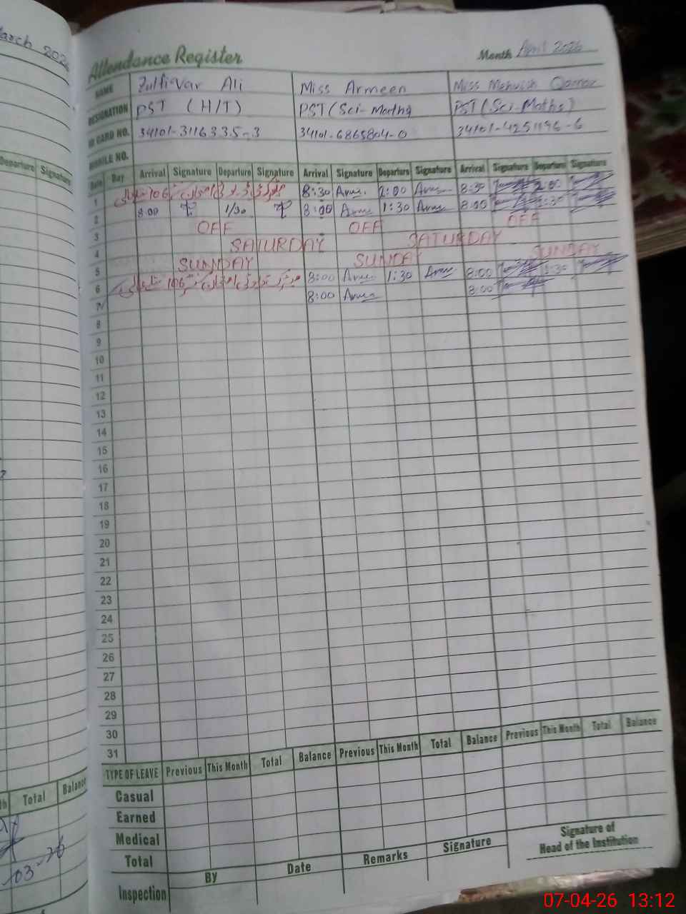 | 34**** | Zu**** Al**** | PST Arts | Regular | 0 | 0 | 0 | 0 | 0 | 0 | 0 | 0 | 0 | Exam Duty |