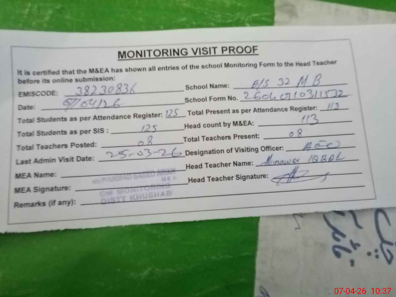 | EMIS Code: 38230836 | Name of School: GES CHAK NO. 32 MB | |||