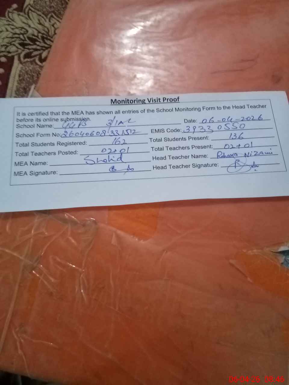 | Attendance Register | Head Teacher | MEA with School | Visit Proof |