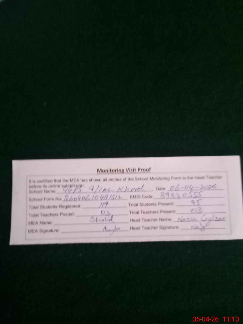 | Attendance Register | Head Teacher | MEA with School | Visit Proof |