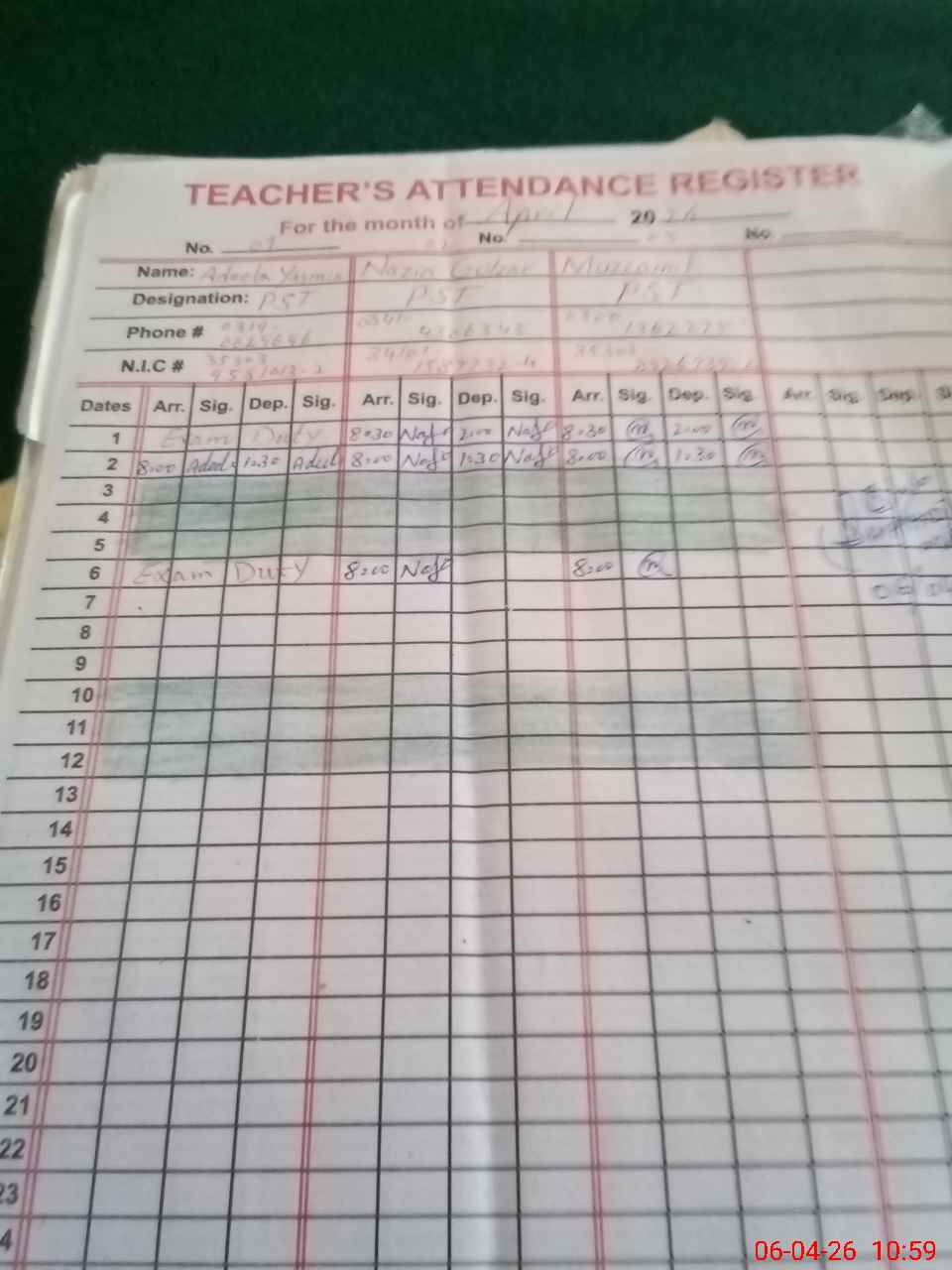 | 35**** | Ad**** Ya**** | PST Arts | Regular | 0 | 0 | 0 | 0 | 0 | 0 | 0 | 0 | 0 | Exam Duty |