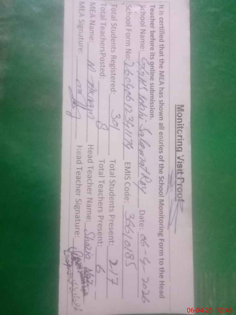| EMIS Code: 36610185 | Name of School: GGHS WAHI SALAMAT ROY | |||