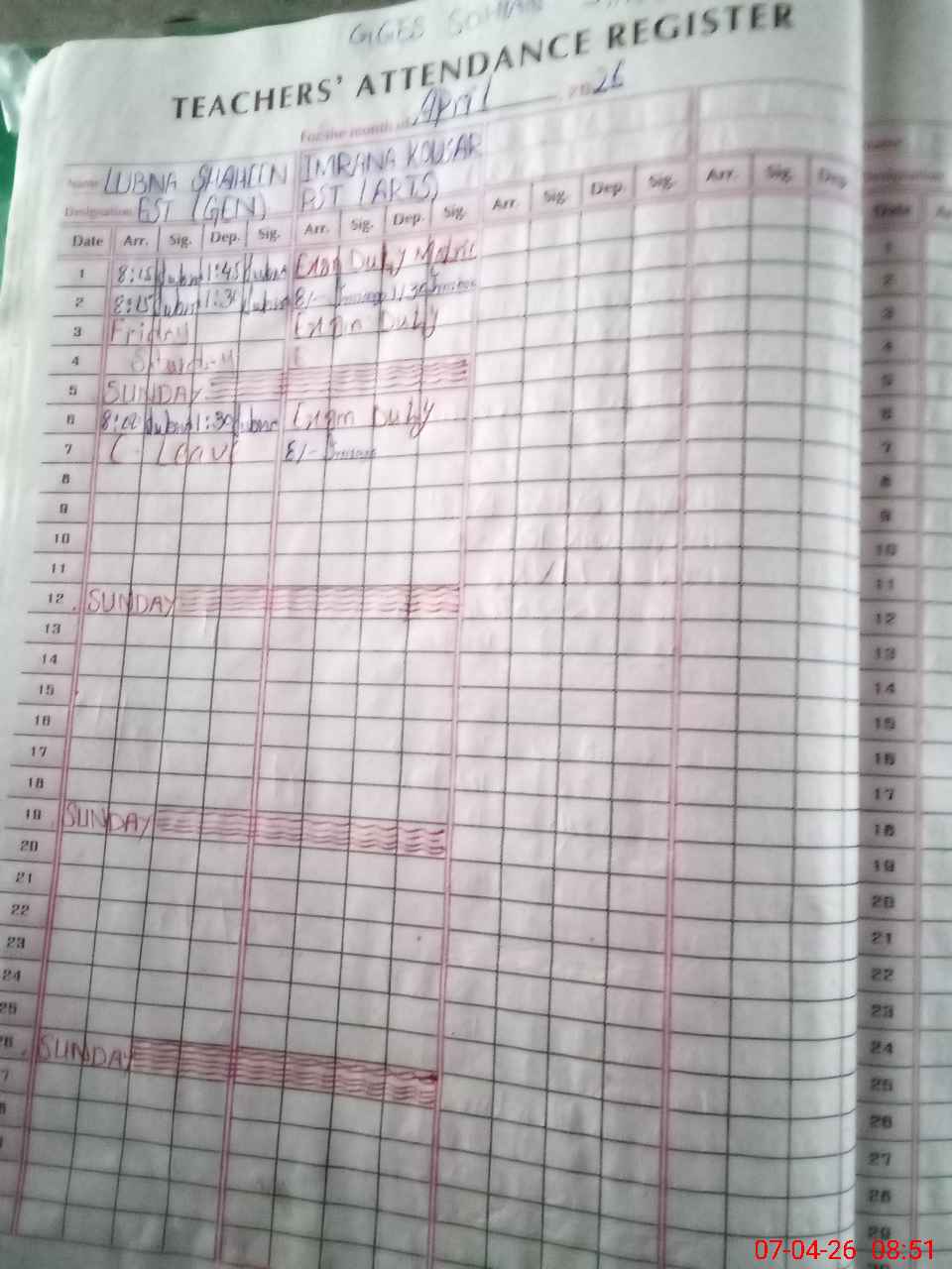 | Remarks (Use Separate Page if Required): EST LUBNA SHAHEEN IS ABSENT FROM SCHOOL NO LEAVE RECORD STI SAWEBA IS IN SCHOOL CLESSES PERMOTED BUT RECORD NOT UPDATE ON SIS NSB IN NEGATIVE | |||||