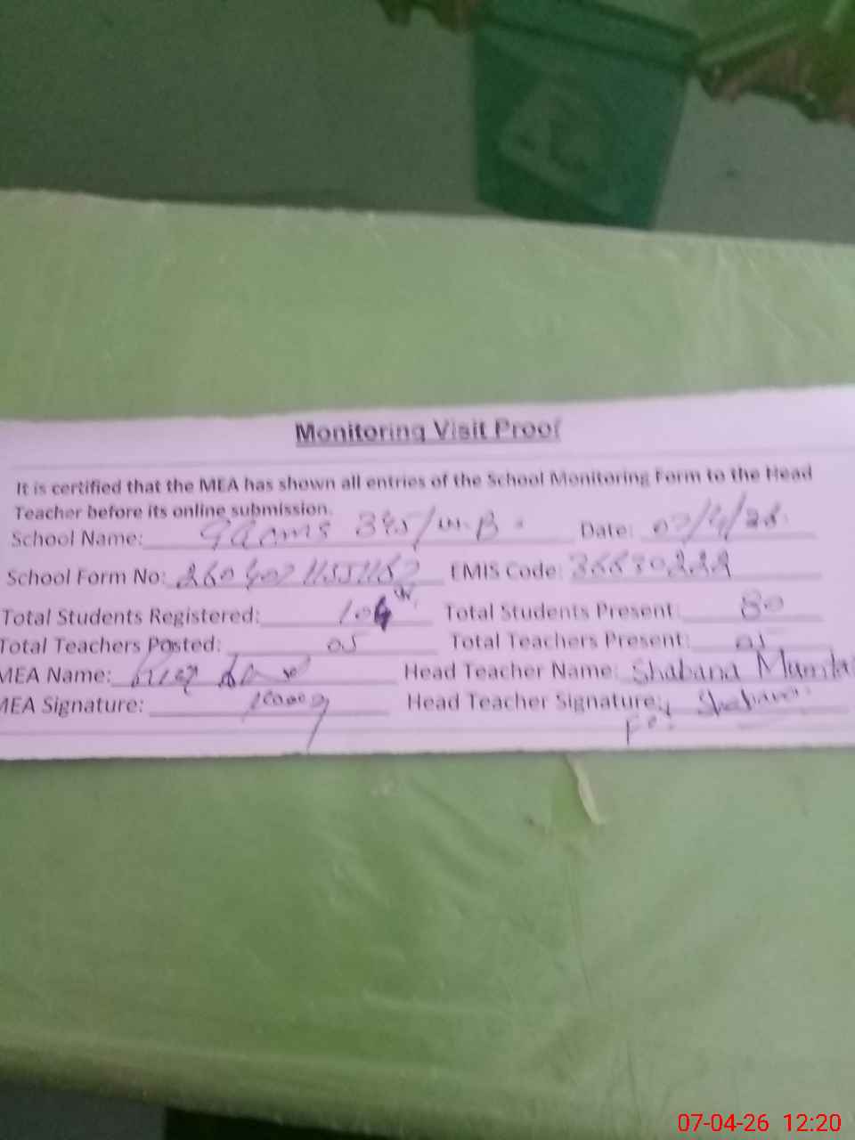 | Attendance Register | Head Teacher | MEA with School | Visit Proof |