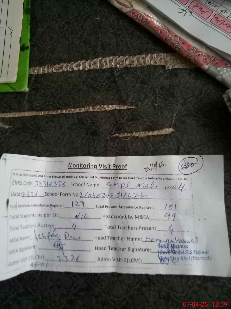 | Attendance Register | Head Teacher | MEA with School | Visit Proof |