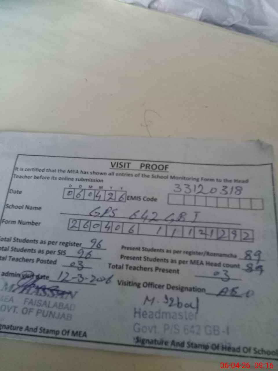 | Attendance Register | Head Teacher | MEA with School | Visit Proof |